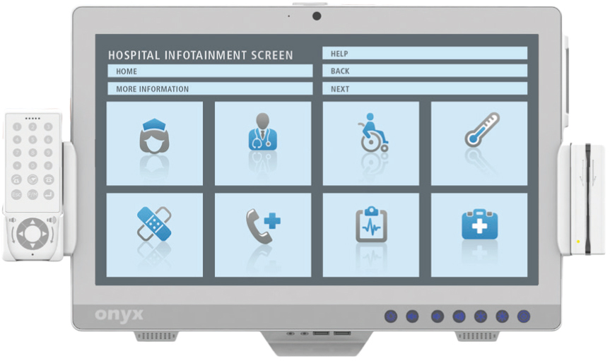 Mit den Healthcare Infotainment Solutions von Onyx können Krankenhäuser ihre Patienten in sinnvolle Prozesse mit einbinden. Denkbare Anwendungsbereiche sind: allgemeines Patienten-Infoportal, Essensauswahl und Menübestellung, Patientenaufklärung, Pflegedokumentation, kognitive spiele zur Rehabilitation direkt am krankenbett oder einfach als Fernseher. Zum einen steigert die Bereitstellung aktueller Informationen und Angebote die Patientenzufriedenheit, zum anderen werden Ärzte und das Pflegepersonal deutlich entlastet. das dynamische Infoportal kann auch zur Vorstellung des allgemeinen Krankenhausangebotes, zur Patientenbefragung, zur Vorstellung des verantwortlichen Pflegedienstes oder für Werbemaßnahmen genutzt werden. die verschiedenen Modelle sind in antibakteriellen Gehäusen eingebettet und überzeugen durch ein breites Spektrum an optionalen Features und Zubehör. Egal ob integrierte Kamera, RfId, Leselicht, Fernbedienung, Alarmsignal, Telefon, TV, Radio oder Bluetooth finden die Vertriebsberater der ICO mit Ihnen zusammen das genau passende Gerät für die jeweiligen Einsatzgebiete.